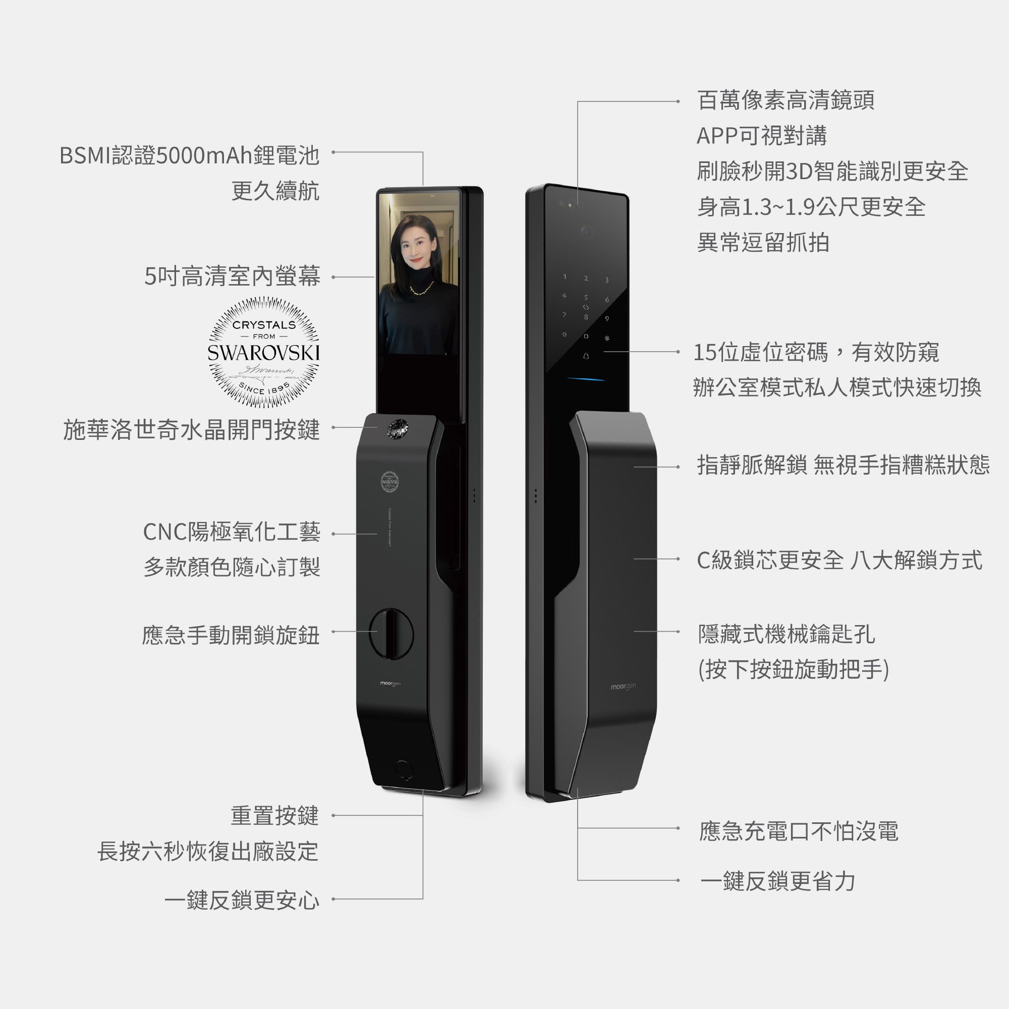 - 面板設計:可更換施華洛世奇水晶開門鍵